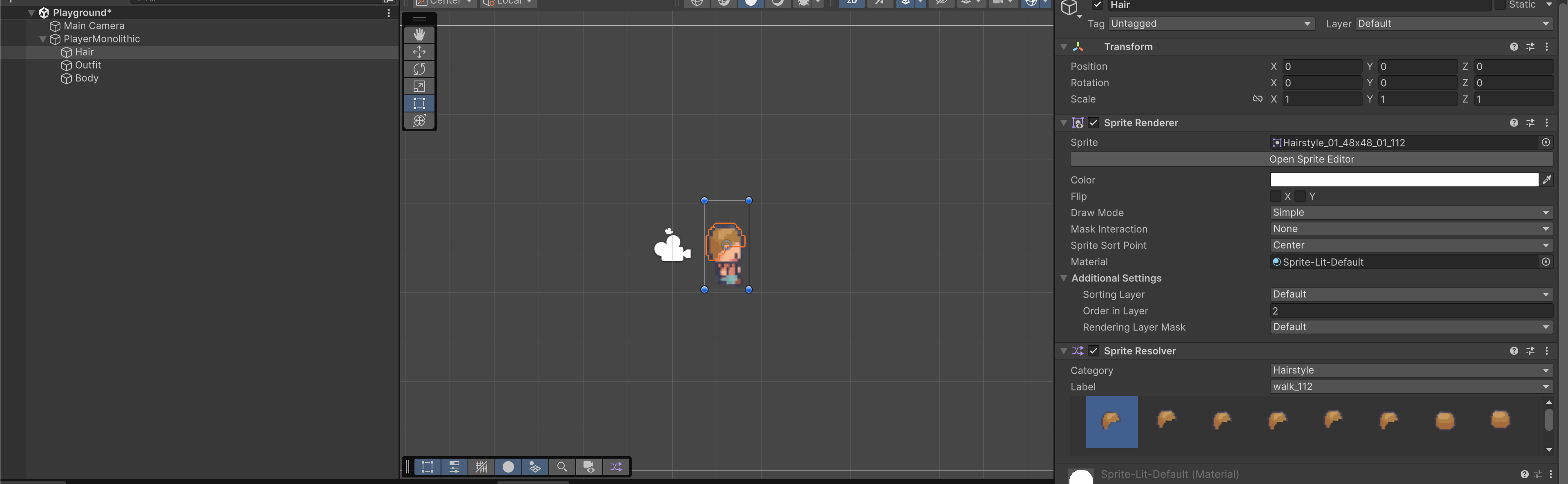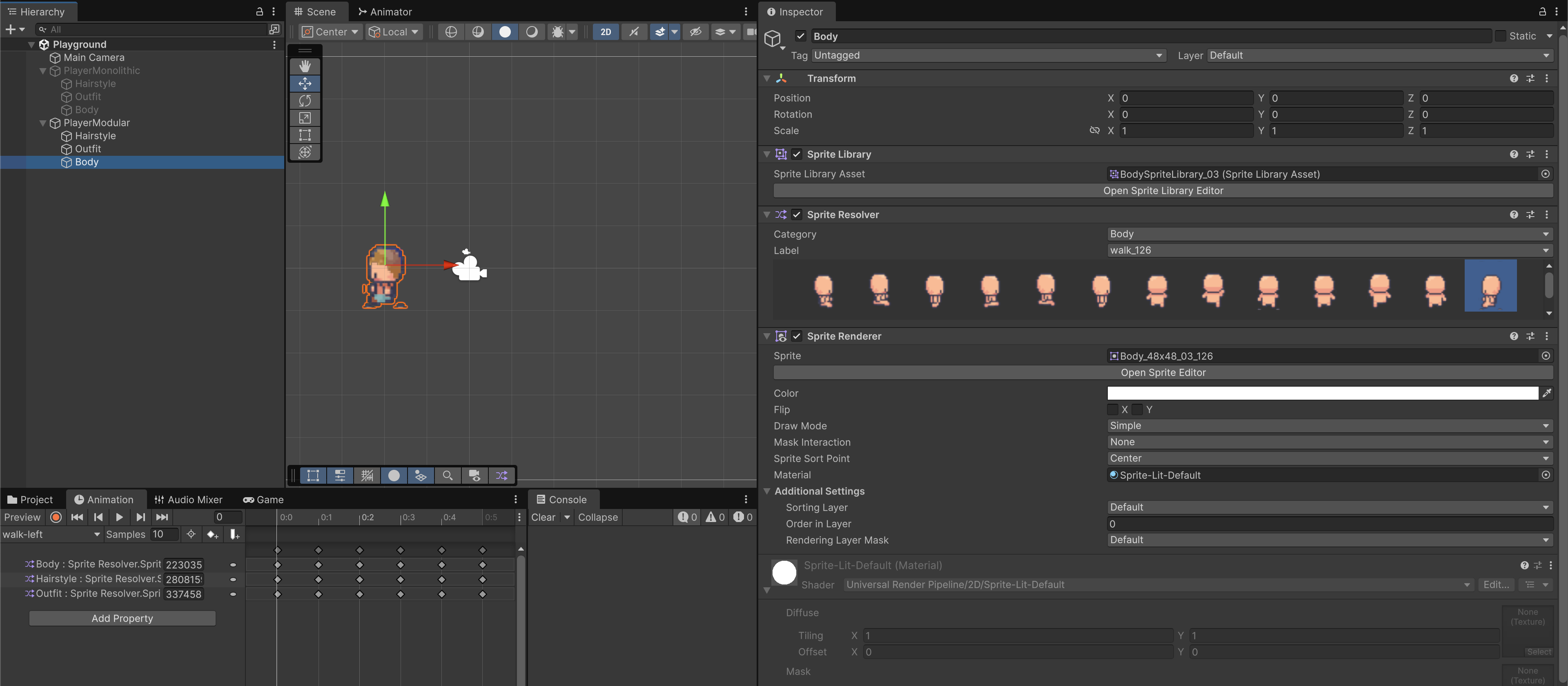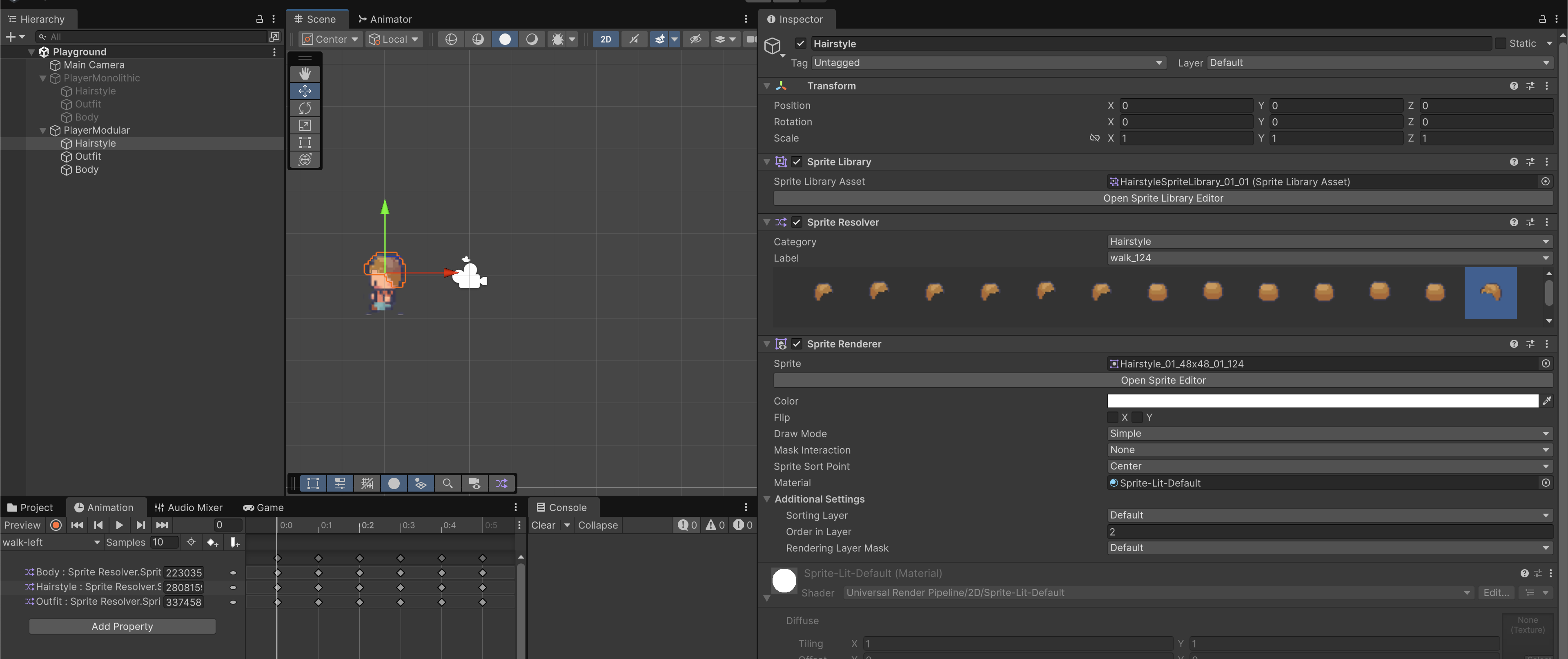 Your Player GameObject has one Animator at the root, but each part (Body, Hairstyle, Outfit) gets its own SpriteRenderer + SpriteResolver + SpriteLibrary