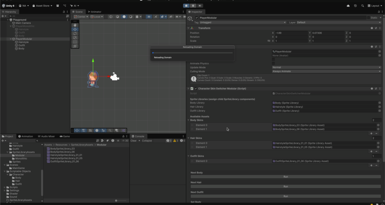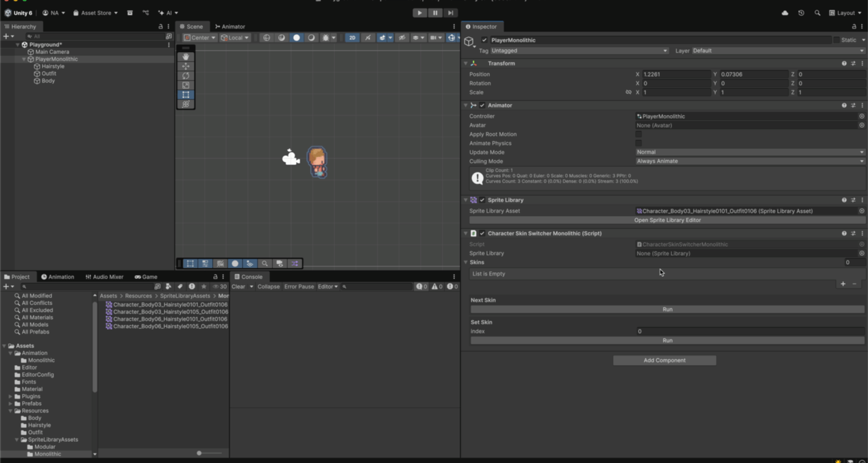 , …), but the active library asset already knows which Body/Hair/Outfit sprites to display for that skin. To change appearance at runtime, you simply assign a different monolithic asset, and the whole character swaps instantly.